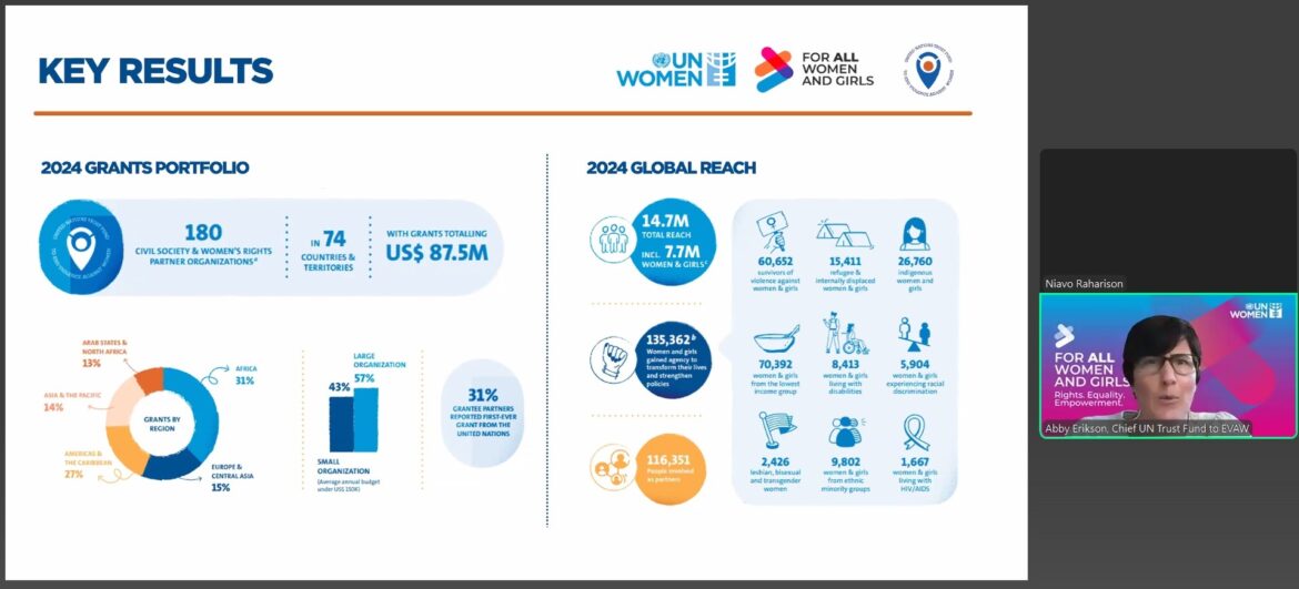 Nakon uvodnog izlaganja Abigail Erikson, direktorke UN Trust Fund-a, prikazan je video sa ključnim rezultatima ostvarenim tokom 2024.godine, ističući da je podrška ostvarene organzacijama u 74 zemlje i projektima kojima je ostvaren doseg do više od 7 milionažena žena i devojčica. https://www.youtube.com/watch?v=Fs1IZy1T-oU